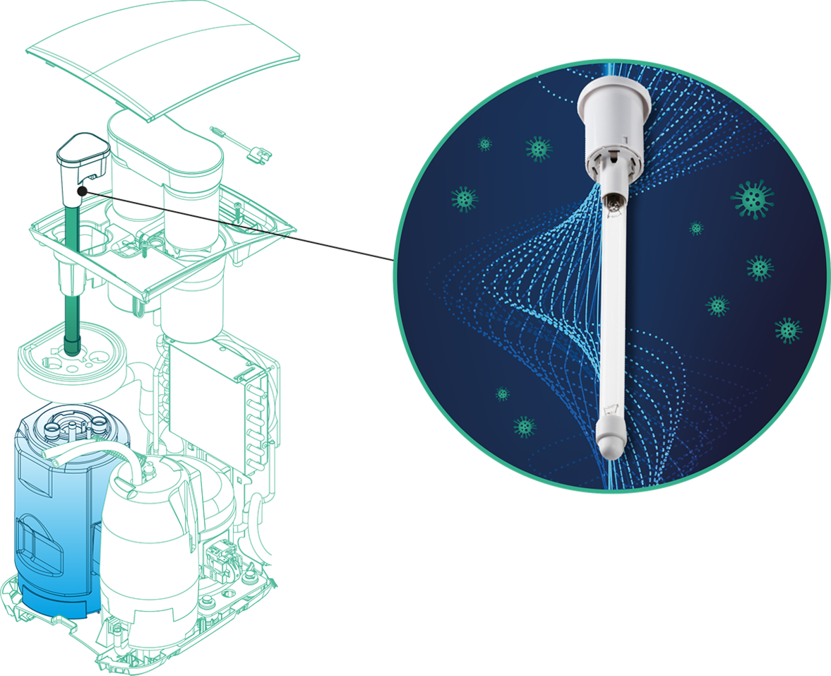 The water is treated with UV, preventing the growth of Microbiological contaminates. This becomes