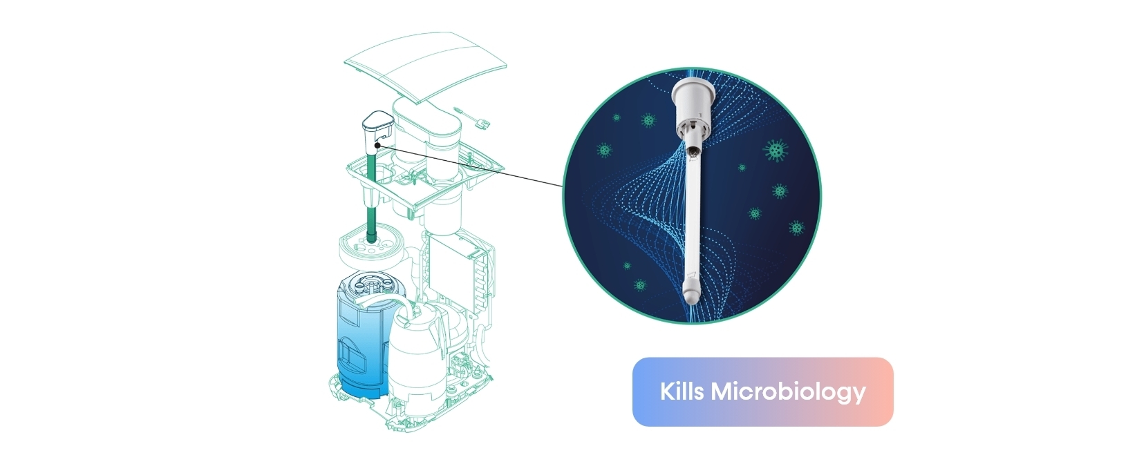 The water is treated with UV, preventing the growth of Microbiological contaminates. This becomes particularly vital once chlorine has been removed. Its why other filters become breeding grounds for bacteria and other parasites.