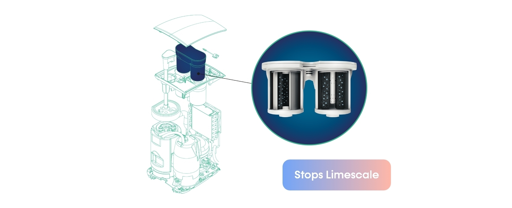 Nobody likes white flakes in their tea; that’s why a Polyphosphate layer embedded into the water filter prevents scale forming as it inhibits the mineral compounds’ ability to bind together and form limescale.